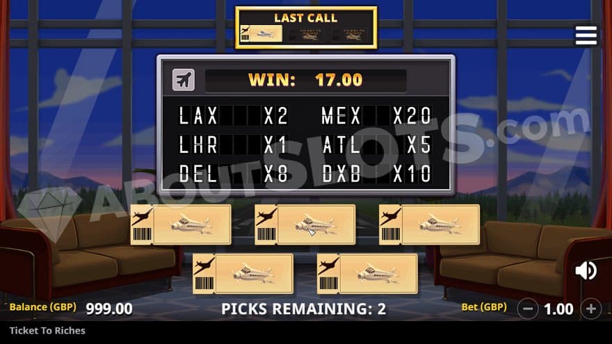 The Last Call is a pick feature where the player gets to pick boarding passes. The player is granted the same amount of picks as the number in the Last Call bonus meter. In other words, you will get the same number of picks as the number of Ticket Symbols you’ve landed on reels 1 and 2. The boarding passes will reveal a grand pass, an extra pick, or a destination pass with a bet multiplier. The multipliers in the destination passes are added together before the sum is awarded to the player at the end of the feature. Picking 3 golden grand passes awards the max win of 5000X the bet.