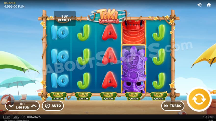 The lower paying symbols are 10, J, Q, K and A. Landing 5 of the same symbol type pays between 0.3X to 2.5X the bet. The higher paying symbols are the 3X1 stacked Tiki symbols which are in the colorโs gold, purple and red. If you land 5 of the same symbol type, it pays between 8X to 10X the bet. The coconut is the game's wild symbol, and the scatter symbol consists of two crossing surfing boards with the text Free Spins on them. Let's find out what the features do.