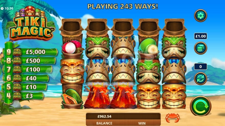 The design of the game is a Tiki theme, where we find ourselves on a beach in Hawaii. In the background of the reels, you can see a blue sky matching the water, with birds peacefully flying around and an impatient crab waiting for you to start spinning the reels. You can play this slot on all the devices notepads, desktops and mobiles. You create a winning combination by landing 3 or more of the same symbol type on adjacent reels starting at the far left.