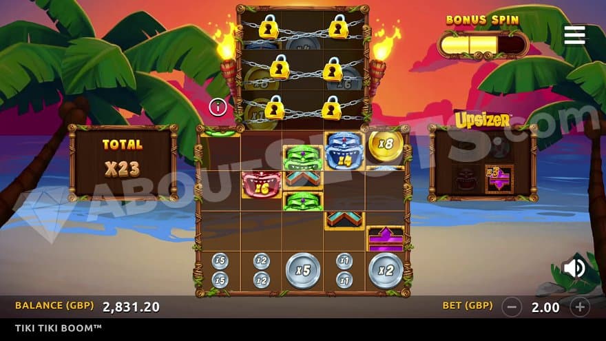 You can boost your chances of winning big by buying one or several features in the Upsizer Menu before the Tiki Tiki Spins start. You can purchase all extras in the Upsizer Max, which will give you four different bonuses.