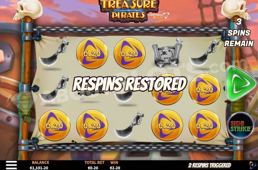 There are several similar features like this one with similar names from other game providers. The Hold&Win feature for example, used by game providers like iSoftBet, Playson, and Stakelogic, works the same. In Treasure Pirates, the feature activates whenever the player lands 6 or more coins on the grid. All coins are locked into their positions while the other positions are cleared. The player gets 3 spins with the ambition of landing more coins on the empty spaces. Whenever a coin symbol hits the grid, the spins are reset to 3. If a collect symbol lands, all the coins are collected and paid to the player before the grid is cleared and the player gets to start over with 3 respins on an empty grid. The feature is over when the player runs out of spins or when all 15 positions are filled with coins.