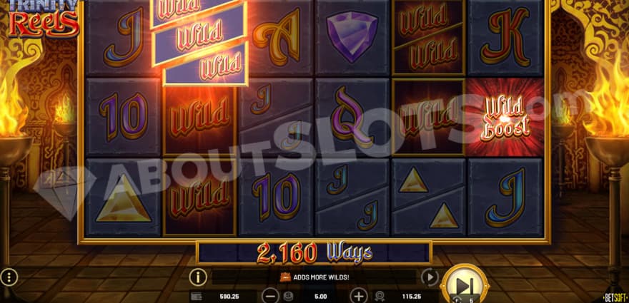 The different boosts can land on reel 6. The wild boost will change 1-2 random paying symbols on reels 2 to 5 into a wild symbol split into 3.