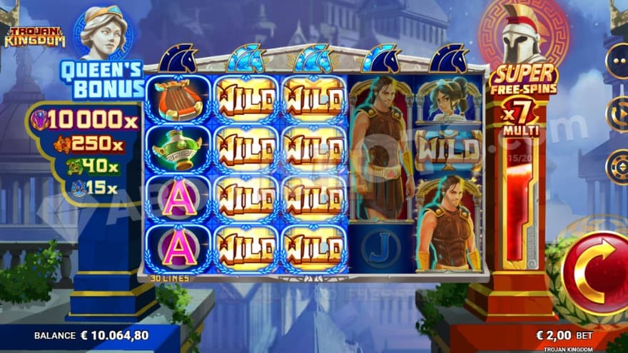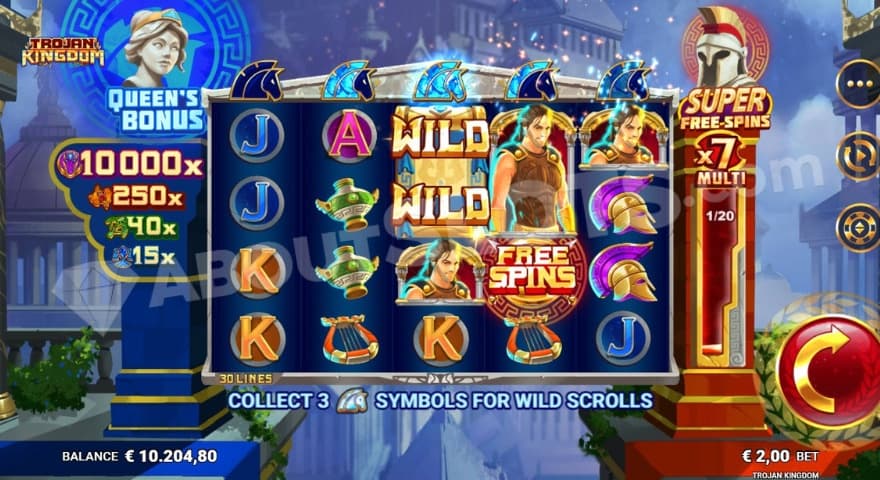 Instead of soldiers, this Trojan horse is filled with a plethora of exciting mechanisms. The features are Wild Symbol, Bonus Symbol, Scatter Symbol, Wild Scrolls, Queen’s Bonus, Free Spins, and Super Free Spins.