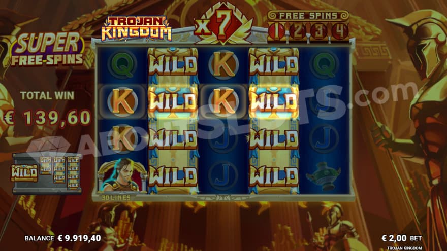 Super Free Spins follow the same rules as the normal feature but has a multiplier of 7x. Furthermore, Wild Scrolls are active on reels 2 and 4 from the get-go.