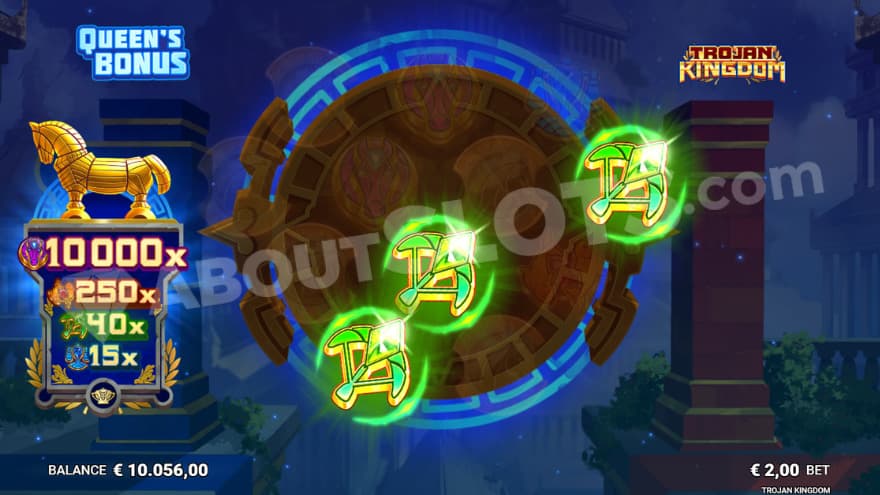 Gameplay-wise, Trojan Kingdom has a lot to offer. It’s stacked with exciting features, keeping you entertained at all times. If you’re not chasing big wins in the Free Spins, you’re stacking up Bonus symbols in the base game for some juicy hits. Aside from all that, there’s also the Queen’s Bonus aspect. It can be triggered randomly on any spin, so the game always keeps you on your toes!