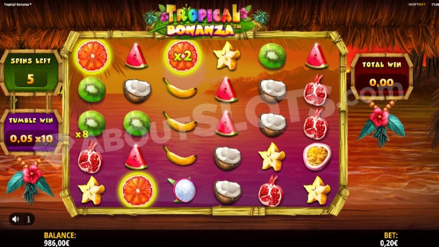 Tropical Bonanza is a video slot from iSoftBet that features 6 reels and 5 rows. There is a pay anywhere mechanic that has been applied to this game, where 8 or more of the same symbol type on the reels results in a win. You can choose between making a Min.bet of 0.20 and a Max.bet of 25. The game has an RTP that is slightly below average, where it is an RTP of 95.98%, but by activating the Extra Juice feature, the RTP increases slightly to 96.05% and during the bonus buy the RTP is 96.40%. Tropical Bonanza has a hit frequency of 29.3% and a medium volatility, where you can win up to 5887X the bet.