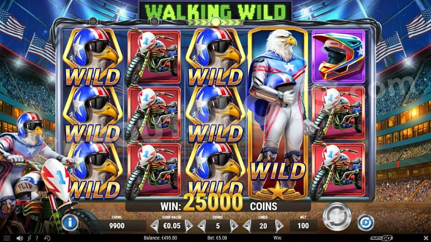 Several spectacular things are happening in the motor stadium. Whenever the eagle comes flying on his bike, watch out for the features Wild Symbol, Scatter Symbol, Stacked High-Paying Symbols, Respin, Walking Dead, and Free Spins.