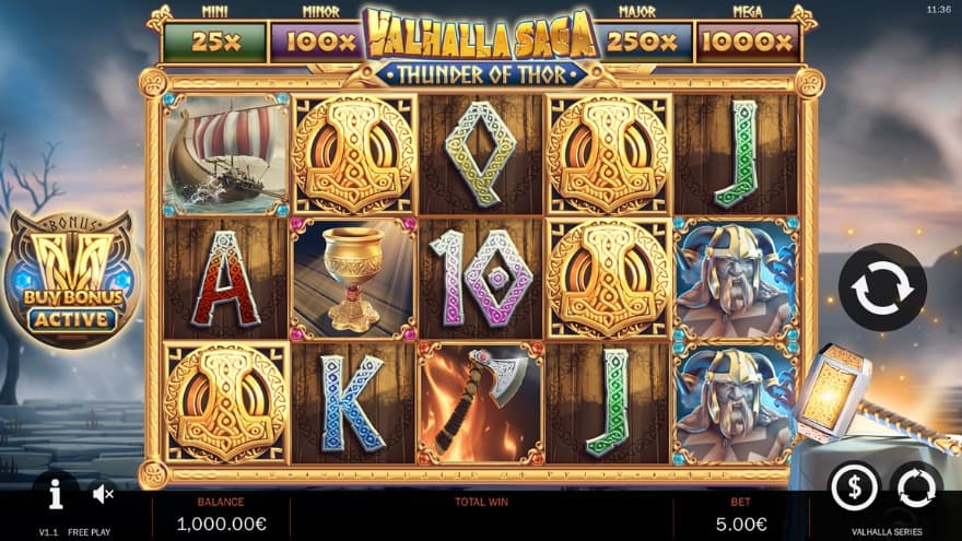 The lower paying symbols are 10, J, Q, K and A. Landing 5 of the same symbol type pays between 1X to 5X the bet. The higher paying symbols are a grail, an axe, a Viking ship and Thor himself. If you land 5 of the same symbol types, it pays between 10X to 25X the bet. The golden coin showing Thor's hammer Mjölnir is the scatter symbol and the symbol showing Mjölnir with the text wild is the game's wild symbol. Let's find out what the features do.