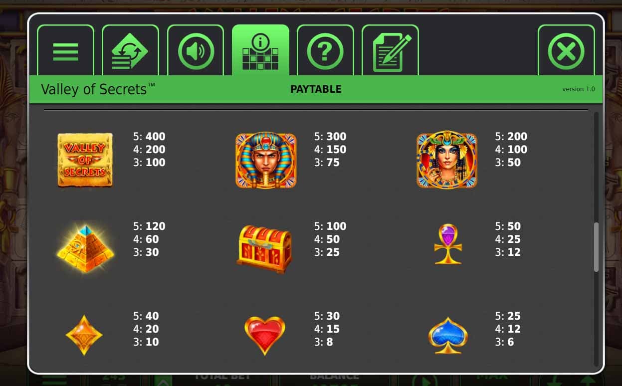 As previously mentioned, the Valley of Secrets slot features an impeccable design which surely matches its theme. Hopping on this virtual journey means coming across a collection of symbols, beautifully designed including pyramids, scarabs, treasure chests, Cleopatra and Eye of Ra which appear alongside standard paying symbols. The game’s reels are beautifully framed with two massive stone pillars with interesting golden detailing which is also present on the reels.
