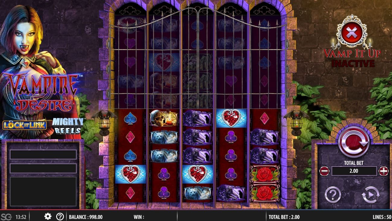 When it comes to the game’s bonuses, players get to benefit from the Vampire Desire slot’s Vamp It Up bonus, Mighty Reels bonus and Lock It Link bonus. The game’s bat wild symbols are expanding wilds which land as bigger 2x2 symbols on the game’s three middle reels. Once they land, they trigger the game’s Mighty Reels mode which further brings wild reels. Moreover, this mode increases the game’s number of paylines from 50 up to 100 for a better winning potential.