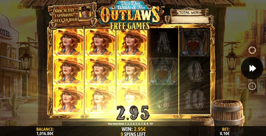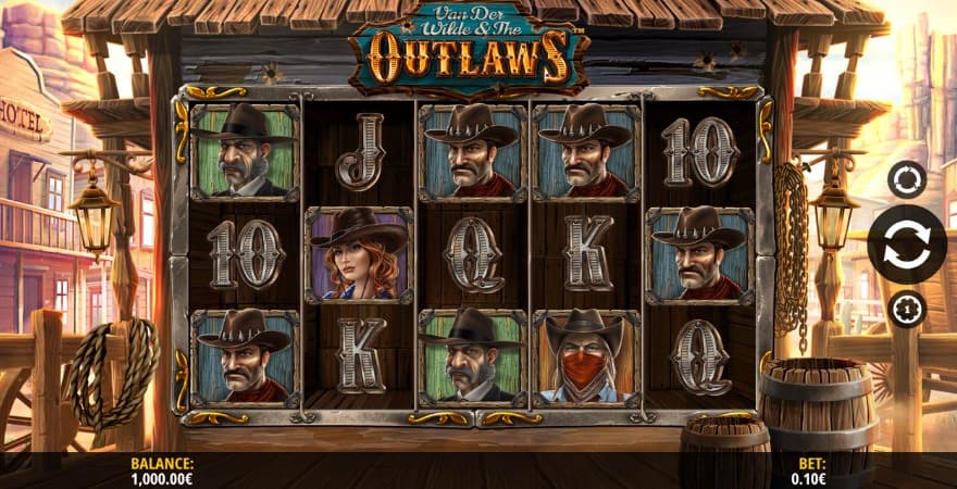 The game's design consists of a western theme where we get to meet Van der Wilde and the Outlaws. In the background of the reels, you can glimpse the town we are in, where the reels are surrounded by barrels, lanterns, ropes and the typical wooden buildings. You can play this slot on all notepads, desktops and mobiles. You create a winning combination by landing 3 or more of the same symbol types on adjacent reels starting at the far left.