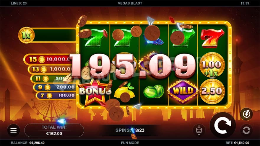 Vegas Blast is a video slot from Kalamba Games that features 5 reels, 3 rows and 20 paylines. One can choose between making a Min.bet of 0.20 and a Max.bet of 60. The game has a higher-than-average RTP, where it is an RTP of 96.48% and by taking advantage of the Hyper Bonus, the RTP can increase up to 96.94%. Vegas Blast has a high volatility and a hit frequency of 29.70%, where you can win up to 10590X the bet.