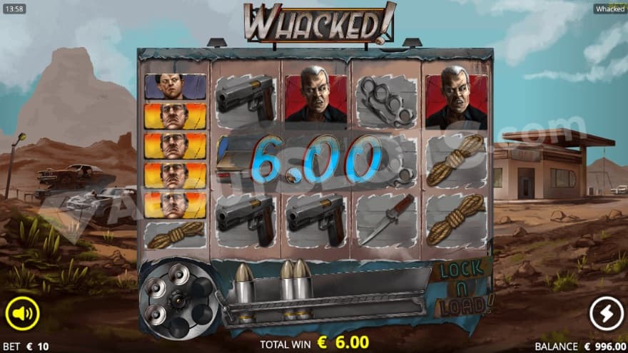 Whenever you make a winning combination, bullets will appear beneath the reels. For each connection, one set of bullets is loaded into the gun. Once the cylinder is loaded with six bullets, the bullets will be randomly fired at higher-paying symbols. The symbols that are hit will be replaced by Wild symbols, which can substitute for all other paying symbols. If there’s not enough targets, unused bullets will be saved in the cylinder for later.