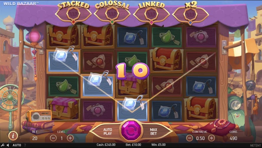 There is one special symbol in Wild Bazaar video slot, and it’s a Wild symbol, which can substitute for all other symbols in order to help you create a winning combination. The reels will also be filled with lucrative chests, worth up to 150 coins. Red, green, pink and blue chest symbols are involved in a special Wild Spins feature. Other, less valuable, but very nice-looking symbols include jewels in different shapes and colors.