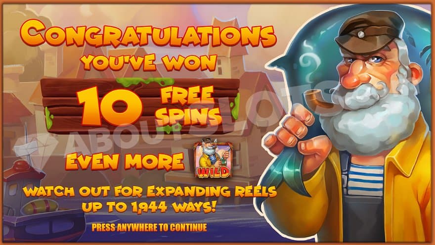 The Scatter Symbol is a fishing boat saying “bonus.” It can appear on reels 3, 4, and 5. Landing 3 scatters activates the free spins with 10 spins. Landing 2 wilds and 1 scatter will also trigger the free spins.