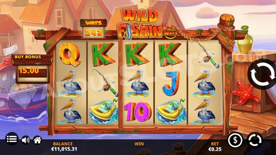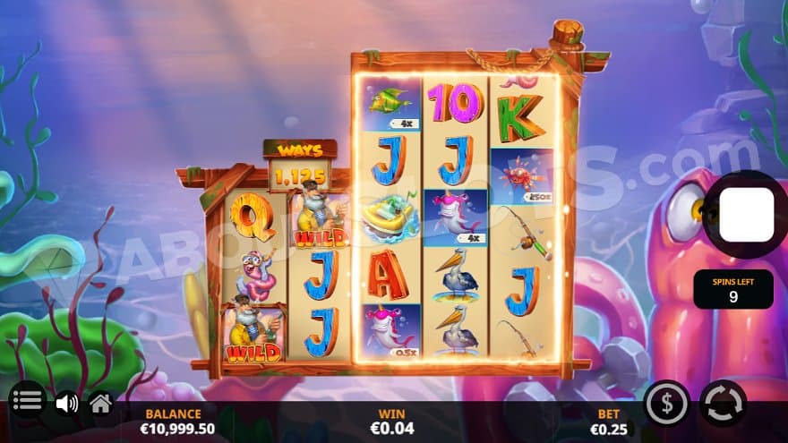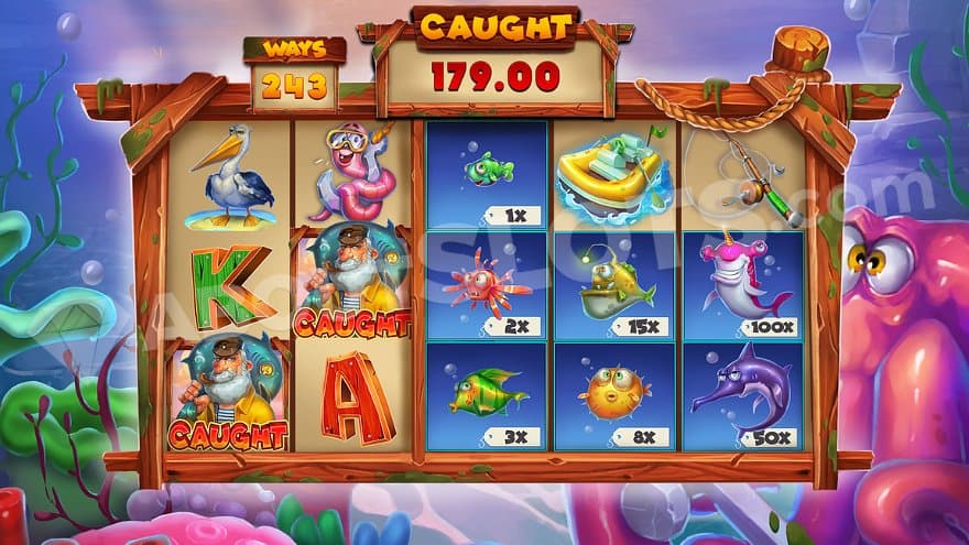 The Wild Ways feature is triggered when landing wild symbols on reels 1 and 2. The wild fisherman will start reeling in the cash value of all fish, starting on the third reel before advancing to the fourth and fifth. All fish will be collected as long as there’s at least one fish on each reel. Fish on the fourth and fifth reel will not be collected if there’s no fish on the third. Wild Ways will trigger the free spins if a scatter lands anywhere on reels 3, 4, or 5.