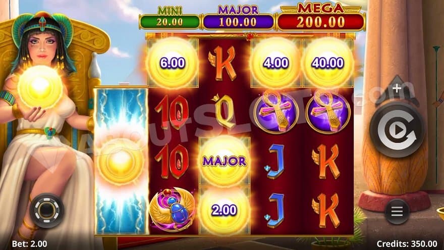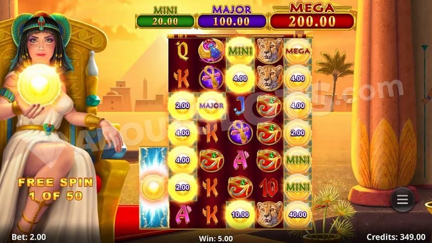 The Wild Link is activated when you land the wild symbol or the sun symbol on the first reel. This feature expands reels 2, 3, 4, and 5 with up to 3 rows in the base game. If Cleopatra is on your side, she can randomly throw in a multiplier of 2X, 3X, 4X, or 5X to the mix. During the Wild Link have all sun symbols a cash value, except the one landing on the first reel, and the value of all symbols is collected after the spin. Let’s say that you land 3 sun symbols with the value of 2, 3, and 7. Your win will then be 12X (2+3+7) your bet, which can be multiplied to a total number of 60 if Cleopatra hands out the best multiplier.