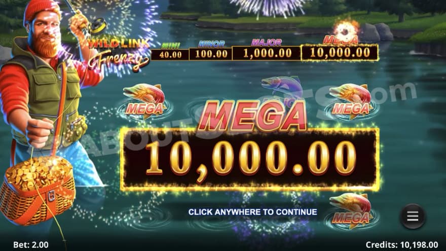 When a Wild fisherman lands on reel 1, the Wild Link feature is triggered. The fisherman nudges to fill the entire reel, and up to 3 extra rows will be added above reels 2-5. During Free Spins, up to 6 extra rows are added. The Wild fisherman will collect all Fish symbols appearing on the reels.