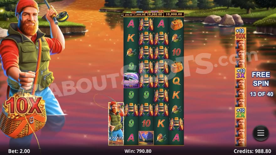 If you’ve ever played one of the Big Bass Bonanza games, you’ll be familiar with this feature. 3 Scatter symbols award 10 spins. Additional Scatters trigger Epic Free Spins, granting between 2 and 5 Wild fishermen at the beginning of the Free Spins. Every time a Wild Link feature is triggered, the fisherman will be collected. Collecting 4 fishermen will retrigger the Free Spins and increase the multiplier. The multiplier is applied to every win when you collect a Fish symbol. Up to 12 fishermen can be collected, awarding a multiplier of 10x if you get that far.