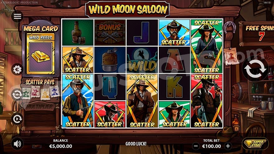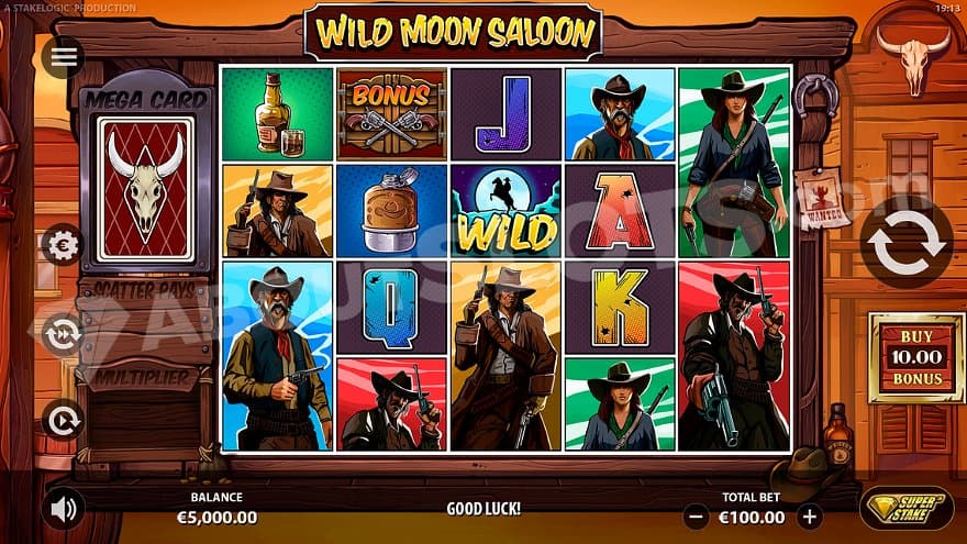 Wild Moon Saloon from Stakelogic has sharp-shooting cowboys, exploding wilds, and free spins with a feature pick where the player can score valuable features that will be used during all spins.