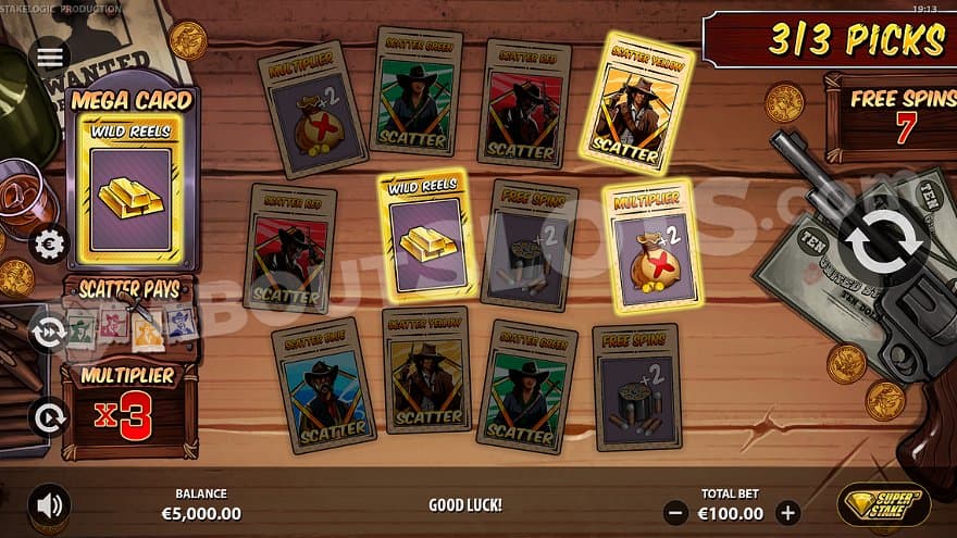 You’ll start the free spins as soon as you’re finished with the bonus pick. You’ll start with a minimum of 8 spins and more if you picked some extra spins in the previous feature. Depending on the outcome of the bonus pick, you might also have a multiplier that multiplies all wins, a wild modifier that puts wilds on the reels on every spin, and one or several scatter pay symbols in the shape of any of the gunslingers.