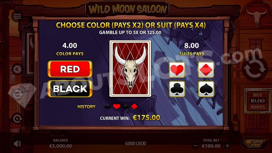 Stakelogic has, as usual, thrown in the golden Super Stake button in Wild Moon Saloon. Hitting the button doubles your bet and increases the chances of activating the free spins by adding more Bonus Symbols to the reels. The paytable doesn’t change, and neither does the RTP.