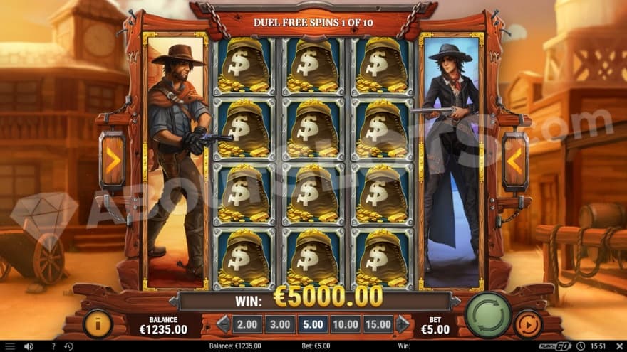 The wilds can only land on the reels 1 and 5, where a fully stacked wild on either of these activates the Walkdown Re-Spin feature. Then the player will get a second chance to successfully retrigger the bonus game and in addition, wins can be created both ways. It's a feature that gives a lovely taste of the game's true potential, but it's clearly within the Duel Free Spins that the real showdowns take place. The fact that the two wild symbols are sticky and also activate the ability to create wins both ways, many times results in hefty wins being created. It is, however, a lower potential maximum win than we are used to seeing within the slot from Play'n GO, but this is very much due to the medium volatility used. The game's RTP of 96.20% is within a great size but be sure to check out which one is used before you spin the reels, as the lower ones give poor conditions. It's a slot that can be quite entertaining at times, but we would have liked something extra to have been added feature-wise, like a multiplier or so, to make the stays more prolonged. Because these showdowns aren't nearly as spectacular as those we've seen recently within the slot Wanted Dead or a Wild.