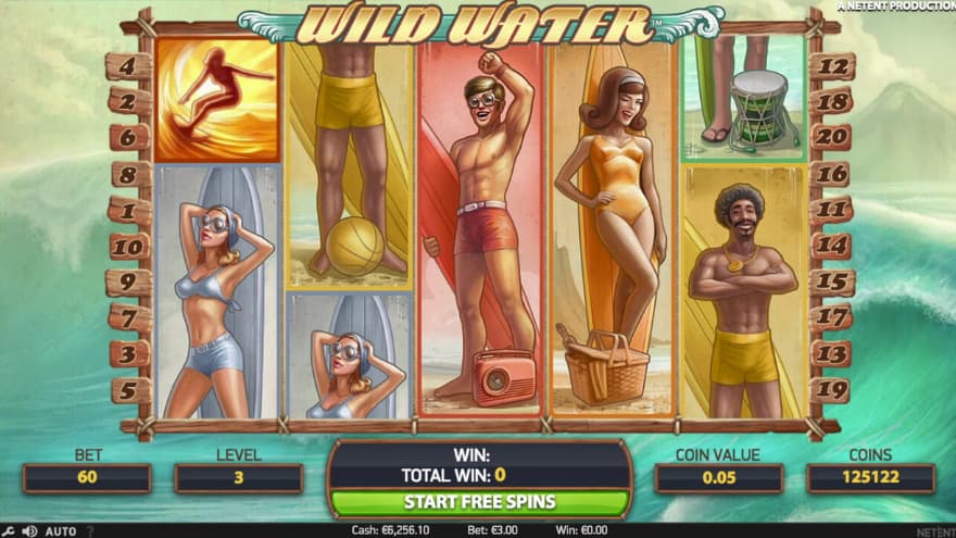 Wild Water is a casino slot from NetEnt where we travel back to the 60s, to a place where the waves are wild, and valiant attempts are made to catch the perfect waves. This is a classic slot from NetEnt that has been very popular among players around the world over the years, featuring stacked surfer symbols, wilds, free spins and bonus wins. Let's dive into this gaming adventure and find out what you can expect to see during the spins.