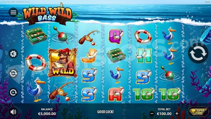 The layout of Wild Wild Bass reminds a lot of the already mentioned Fishin' Frenzy games and the Big Bass Bonanza, taking place underwater with a hint of what is above sea level at the top of the screen. Another recent game with a similar look but shows more of what's above the sea line is Golden Catch, where boats carrying multipliers sail over the reels. There's quite a lot going on in the underwaters of Wild Wild Bass, with rocking corrals, air bubbles, and schools of small fish swimming by at high speed from right to left. The reels are separated by bubbles that don't move like the other ones. Apart from the regular buttons that you find on pretty much every slot is a Super Stake Button positioned next to the Spin Button. It's a feature Stakelogic has used on several games, letting the player raise the bet in order to increase the chances of hitting big wins. To make a win, the player needs to land at least 3 of the same symbols on adjacent reels, starting with the first reel to the left. Wild Wild Bass can be played on all devices such as desktops, notepads, and mobile phones.