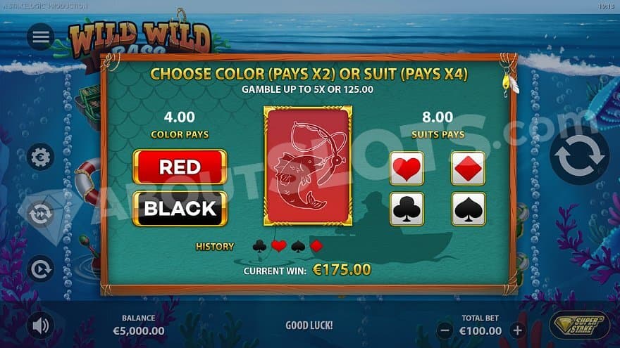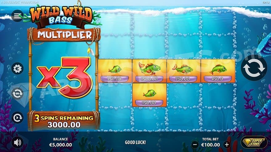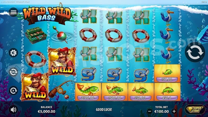 Stakelogic has put this feature on several of their games, letting the player raise the bid a bit to raise the chances of scoring high wins. In Wild Wild Bass, the bet is doubled whenever you hit the Super Stake button. The feature adds extra wilds to the base game, making it more likely to trigger the Big Catch and the Insane Catch. The paytable won't double, though, so a 10X win in the regular mode will only pay 5X the bet in Super Stake mode.