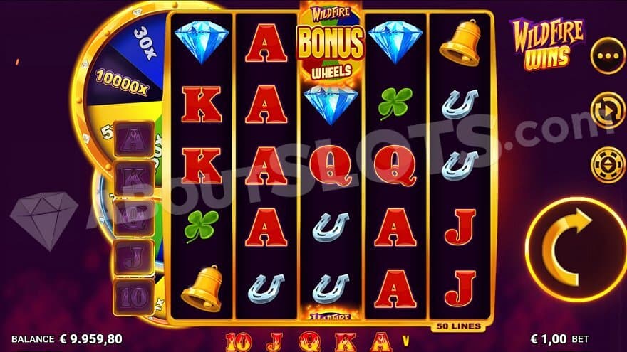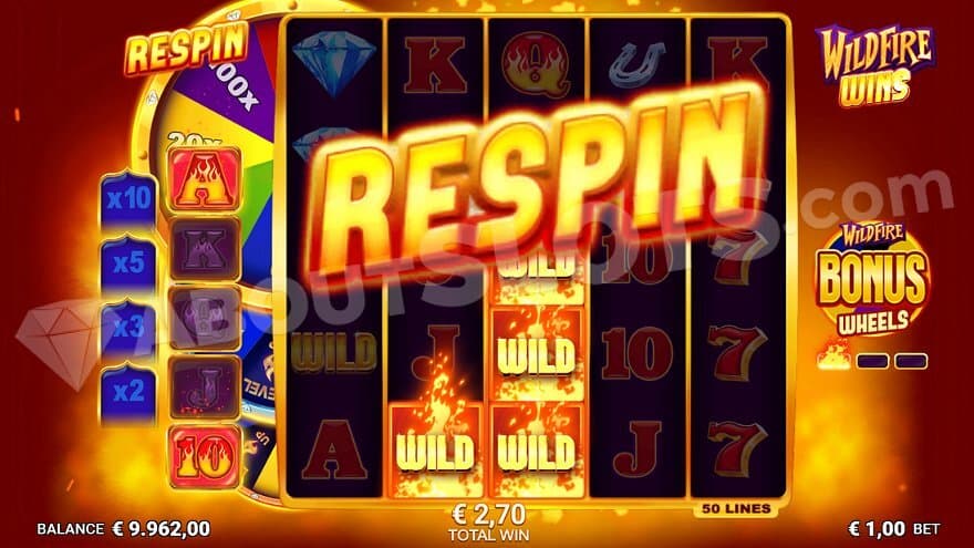 The 5 lower-paying symbols can turn into fire and become Special Symbols. The WildFire Respins are triggered whenever a special symbol is part of a win, and all the symbols of that type become sticky wilds, staying in their positions for a respin. At the same time is a collection meter containing the 5 symbols activated, highlighting the ones that have already turned-on fire. If a special symbol of another type that isn’t activated is part of a win in the respin, it is being marked on the collection meter, boosting another respin. The respins go on as long as a new special symbol is part of a win or until all the 5 special symbols have been activated. If you manage to activate all 5 symbols, there will be a final WildFire Respin, and the win of that spin is multiplied by X2, X3, X5, or X10. If you land a total of 3 Bonus Wheels Symbols during a respin session, you’ll also get a ticket to the WildFire Wheels feature.