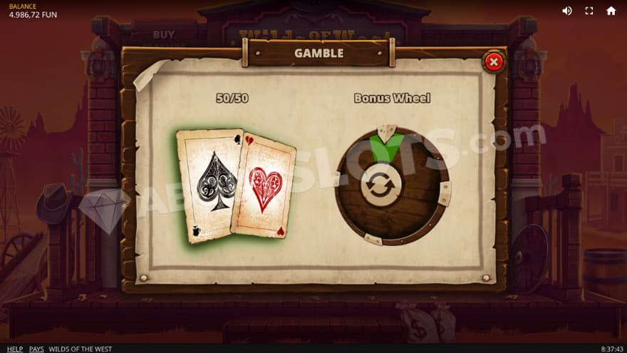 This is not the first time that we have experienced a game where sticky wilds and the wild west collide, as we have seen this before in Dead or Alive, among others. Having said that, it is still a very festive thing to take part in when you see the reels filled up with these special symbols. During the base game, each wild symbol that lands will be assigned a value of between 3 to 5, which often results in the player landing a couple of wild symbols at the same time before they finally disappear. This gives the base game spins an entertaining touch and something that adds an extra layer to the gaming experience is its gamble options, where players can gamble to double the win multiple times by guessing the color of a face down card or they can test their luck by spinning on a wheel, where they activate the bonus game directly by landing on a green field.