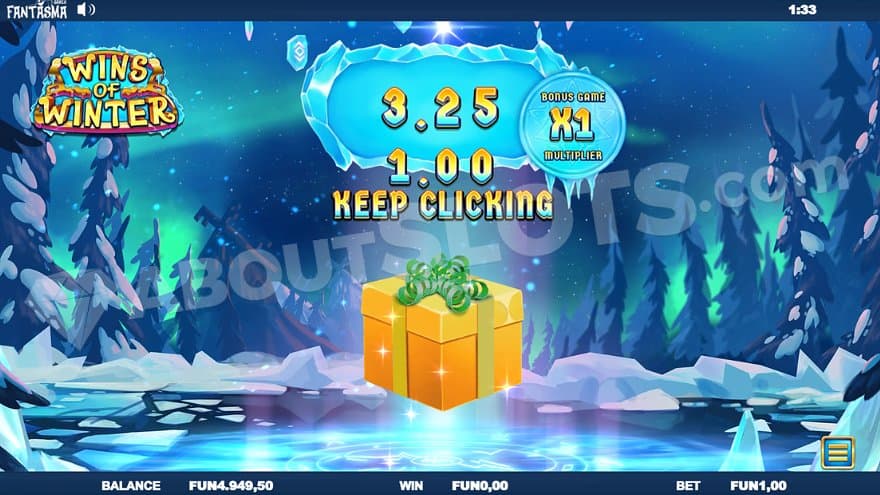 The Bonus Game will have between 9 and 18 gifts waiting for the player. Clicking on each gift awards a cash prize between 0.25X and 20X the bet. All cash prizes are summed up and multiplied by the Bonus Game Multiplier. The multiplier resets to 1X when the game is over, and the base game continues like it was when the feature was triggered.