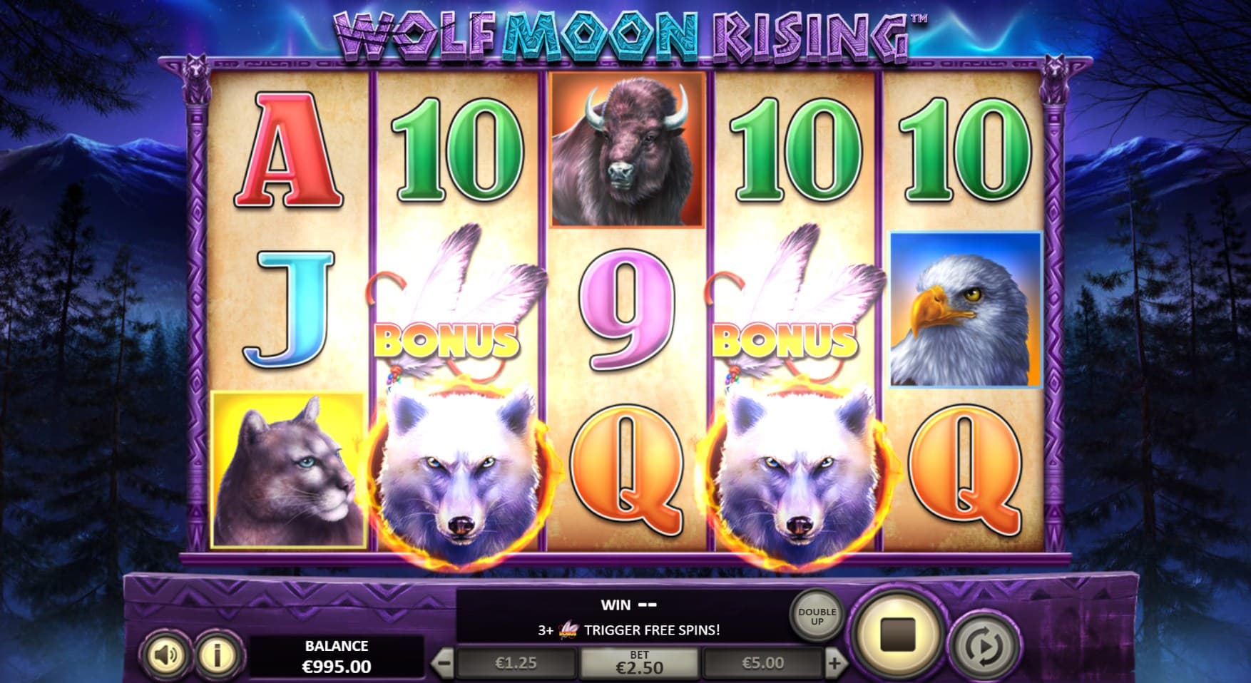 The main character in the game is the wolf which appears alongside other fearless creatures such as mountain lions, buffalos and eagles. The symbols are crafted with the interesting Native American vibe which once again matches the game’s theme. Besides those premium symbols, the Wolf Moon Rising slot also comes packed with six royals packed in different colors with rough edges.