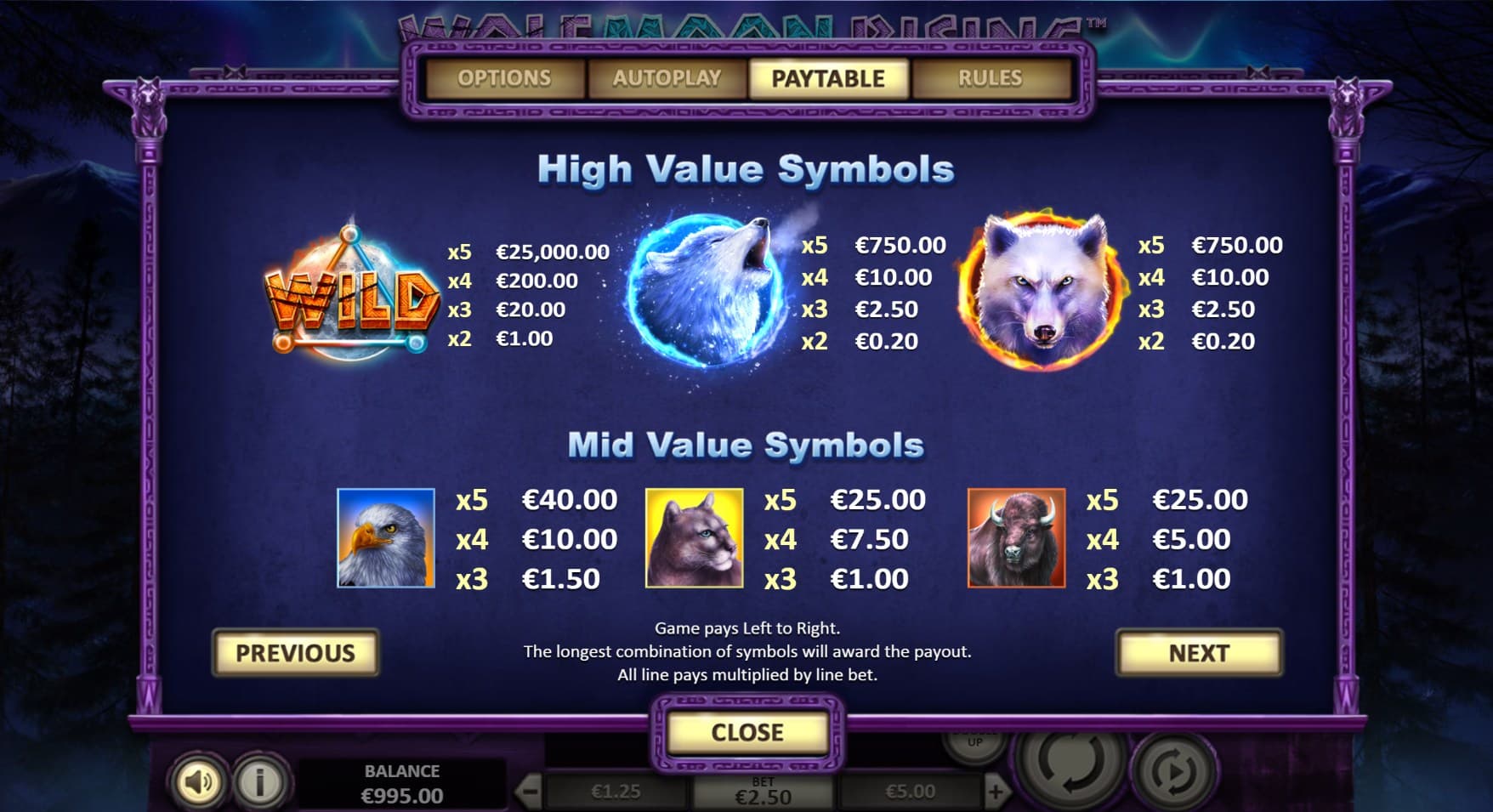 During their gaming sessions, players should definitely keep an eye on the game’s bonus symbols including its wilds and scatters. Wilds, as expected, replace regular symbols on the reels while scattered bonus symbols trigger the Wolf Moon Rising bonus mode including its Feather Talisman Free Spins bonus which delivers remarkable winnings with the game’s Elemental Wild symbols.