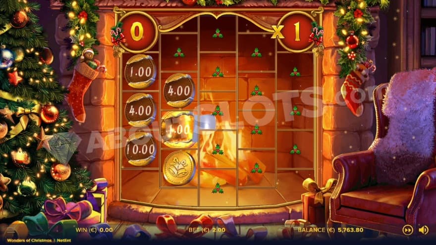 The lower paying symbols are 10, J, Q, K and A. The medium paying symbols are Christmas stockings and a snow globe. The highest paying symbols are a gingerbread house, a toy train and Santa's sleigh. The decorated Christmas tree is the game's scatter symbol and the gift surrounded by a golden frame is the game's wild symbol. During the bonus game you will be able to scoop up large amounts of chocolate coin symbols. Let's find out what the features do.