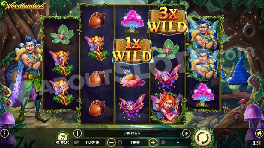 The lower-paying symbols are acorn, flower with green leaves, pink flower, and a purple mushroom. They will give you between 1.2X and 1.6X the bet for a 5-of-a-kind win. The higher-paying symbols are 5 different fairies. The 3 children pay the same, giving the player 3.2X the bet for a full winline. The parents in the Woodlanders family pay between 4.8X and 6X the bet if you land 5 of them on a winline. The Wild Symbol substitutes all mentioned symbols, but not the Scatter or Mystery.