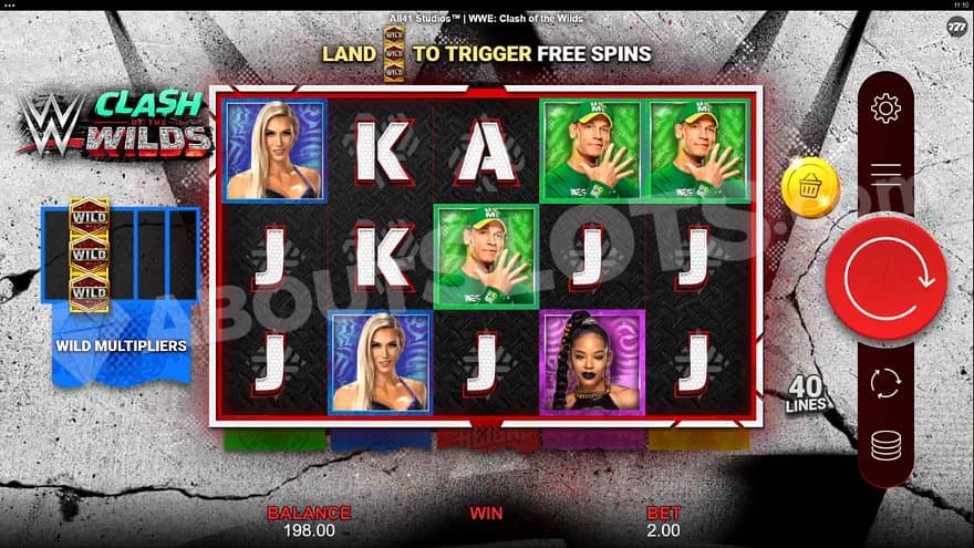 WWE: Clash of the Wilds is a video slot from All41Studios with 5 reels, 3 rows, and 40 paylines. The Min.bet is 0.2, and the Max.bet is 25. This fighting game has an RTP of 96.13% and high volatility. Landing the max win will give the player 10000X the bet, and the fights are executed to a hit frequency of 31.13%.