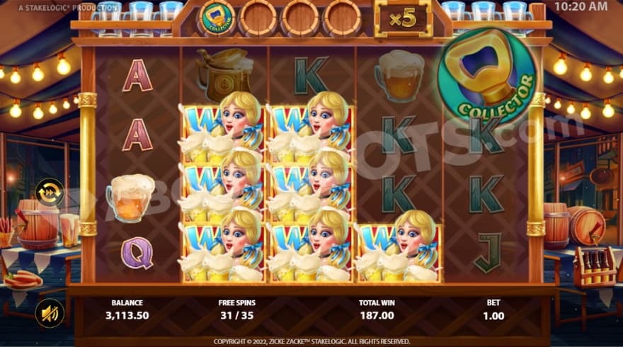 The beer tower feature will be triggered when 4 wild symbols land on top of each other on a reel. It awards 3 re-spins in which the wild reel is locked. When the re-spins are over and the beer empty, there is a chance that it offers a refill, which resets the spins.