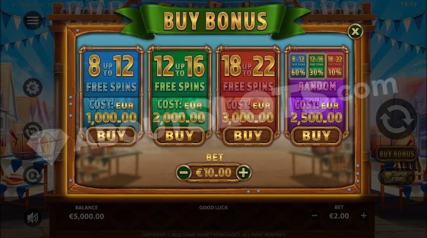 There are some great features to help guide you through this exuberant slot game. The features are Wild Symbol, Scatter Symbol, Beer Tower, Free Spins, Super Stake, and Bonus Buy.