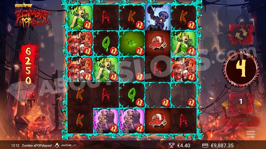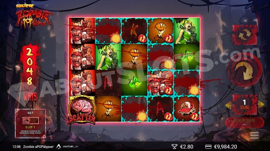 Zombie APOPalypse is a new casino slot from Avatar UX with attacking zombies, frightened people, and some body parts. It has the developer’s brand new MultiPop mechanic, where symbols taking part in a win disappear while new ones are added with a multiplier. Although it’s new, it resembles Avatar UX’s PopWins mechanic, which we have seen in PapayaPop and MonkeyPop, to mention a few. The symbols in this zombie-infested world pay both ways, giving the player 2048 ways to win in the base game and 6250 ways to win in the free spins when an extra row is added.