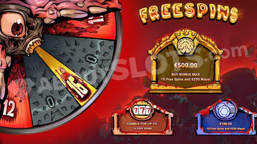 The lower-paying symbols are Q, K, and A. They will give you 0.4X the bet for a win containing 5 symbols. The medium-paying symbols are a green ribbon, a hand holding an American football, and the upper part of a head wearing a red and white baseball hat. These symbols will all give 0.5X the bet for a win containing 5 symbols. The higher-paying symbols are five people trying to flee from zombies. You’ll find a policeman pointing a gun, a blond woman crying, a man in a suit, an American football player, and a man wearing a red and white hat. Now you’ll probably understand to whom some of the medium-paying body parts belong. Landing a 5 symbol win with any of these 5 characters will pay between 0.75X to 2X the bet. The Scatter Symbol, which can trigger the free spins, is a brain. There’s no Wild Symbol in this mayhem.