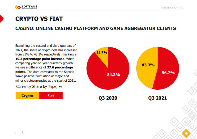 Cryptocurrency is slowly catching up with FIAT currencies. Looking at the Q3 2020 we can see that the amount of bets in crypto vs fiat increased by 27.6 percentage points in the same period in 2021.