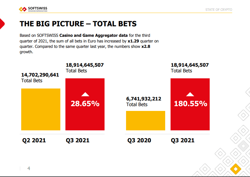 The most interesting data drawn from the Q3 2021 is that the amount of bets in cryptocurrency is raising. In fact, compared to 2020, the increase was 2.8 times. The trend continued throughout 2021, so much so that the increase from Q2 2021 to Q3 2021 is 28%.