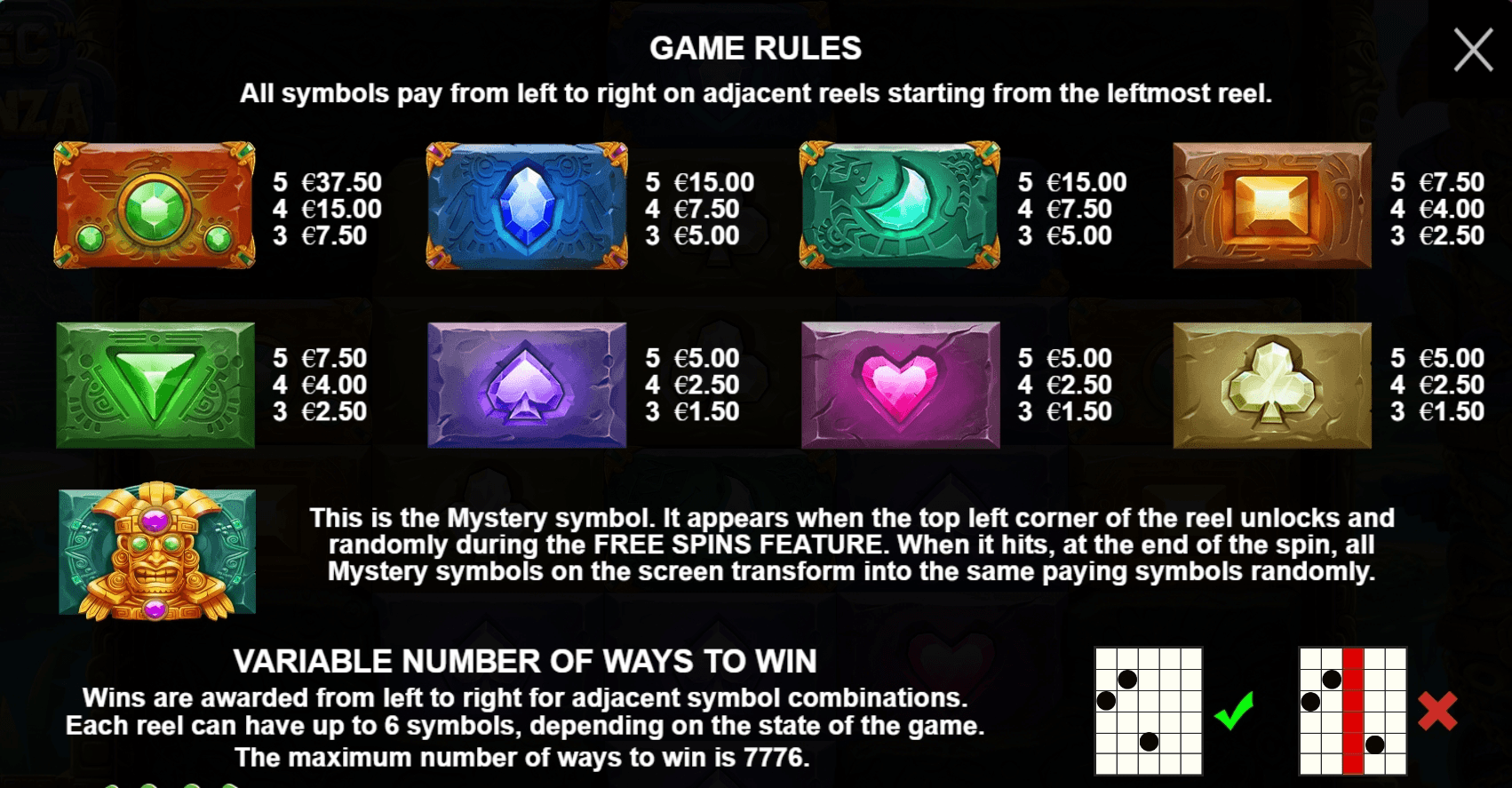 The main feature of the Aztec Bonanza slot is the Mystery Symbol, which can appear during both the base game and the free spins. In base game, every winning spin will cause symbols to fall through and new symbols to replace them. Two consecutive wins cause one locked corner of the screen to get unlocked. When the top left corner is unlocked, mystery symbols will appear on the reels, often triggering further reactions.