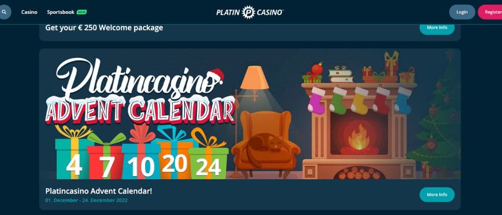 Platin Casino invites all players to participate in their Xmas countdown. It consists of an advent calendar from December 1st and all the way until Christmas Eve. The sack is loaded with all your favourite offers, including deposit bonuses, various free spin offers and gifts.