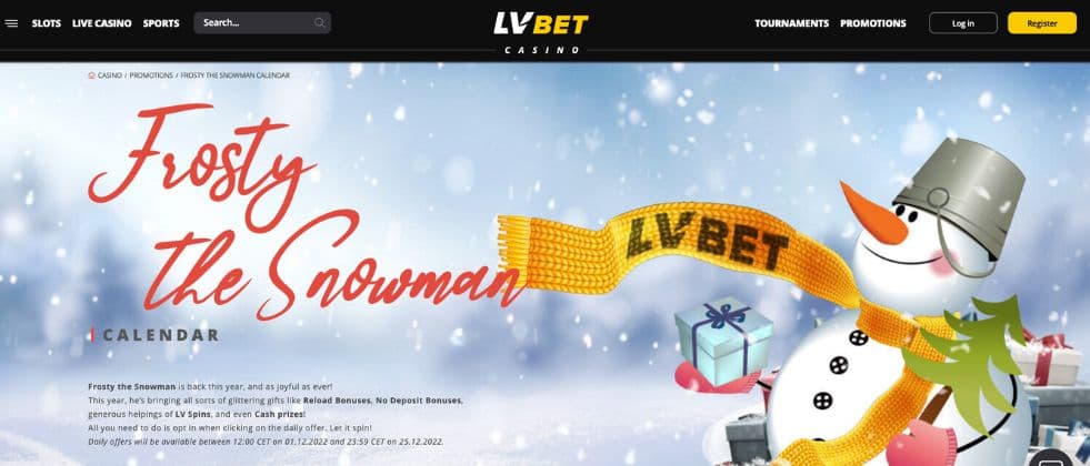 Frosty the Snowman is back at LV BET and is as joyful as ever! This year, he’s bringing all sorts of glittering gifts like Reload Bonuses, No Deposit Bonuses, generous helpings of LV Spins, and even Cash prizes! All you need to do is opt in when clicking on the daily offer. Daily offers will be available between 12:00 CET on 01.12.2022 and 23:59 CET on 25.12.2022. Opt-in to the Snowman Adventure Leaderboard and compete in five tournaments to share a €9,000 Prize pot plus another €2,000 Prize pot AND 5,000 LV Spins! Dig deep enough and be number one on the leaderboard to take home a €1,000 bonus prize! You have from 10:00 CET on 02.12.2022 to 10:00 CET on 27.12.2022.