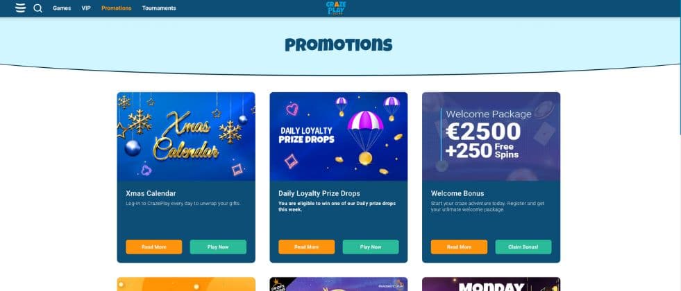 Crazeplay could have chosen one Christmas promotion, but instead chose to offer them all! For example, there’s a Xmas 1000 Free Spins Tournament starting on December 30, 2022 12:00 AM, and another one starting on December 22, 2022 12:00 AM. On top of that, there’s a Prize Pot - €500 + 500 Free Spins in Spinions X-mas Party™ starting on December 19, 2022 12:00 AM and a Prize Pot - €500 + 500 Free Spins in Santa's Stack starting on December 16, 2022 12:00 AM. Basically, you won’t have time to get bored!
