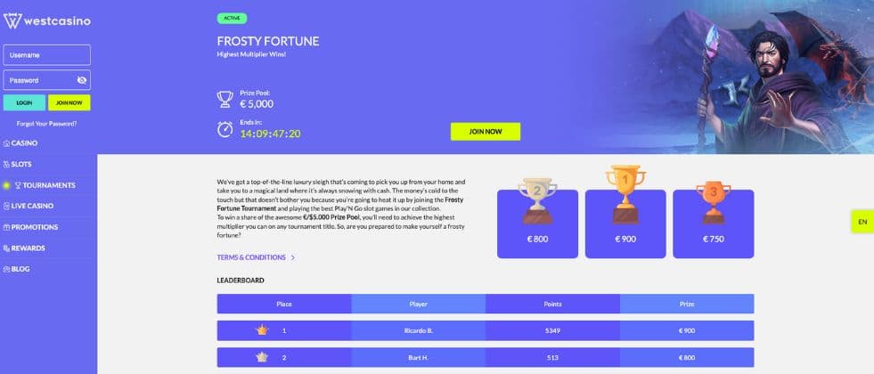 West Casino constantly offers new tournaments, so it doesn’t come as a surprise that Christmas will also be packed with opportunities to win. Join the Frosty Fortune Tournament and play the best Play’N Go slot games in the casino’s collection. To win a share of the awesome €/$5.000 Prize Pool, you’ll need to achieve the highest multiplier you can on any tournament title. So, are you prepared to make yourself a frosty fortune?