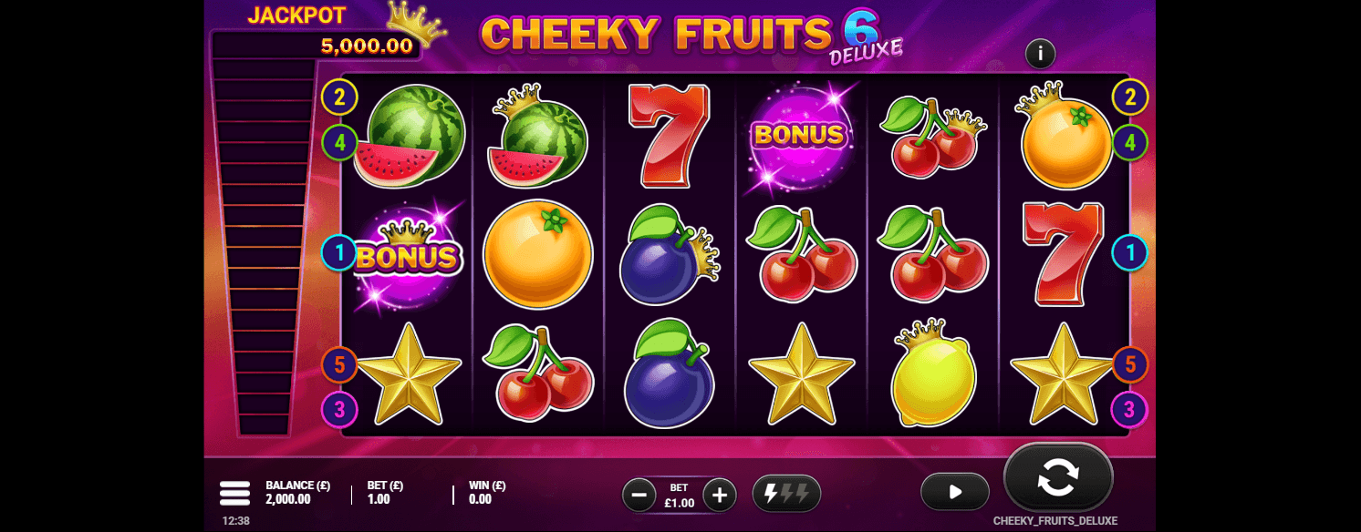 Cheeky Fruits Deluxe is the most beloved slot by G.Games, and it is a 6 reel, 3-row video slot. The game is played with 5 bet lines (fixed), orientated from left to right. The bonus symbol is a scatter symbol. 3, 4, 5 or 6 scatter symbols will trigger 10/15/20/25 free spins of the bonus game.